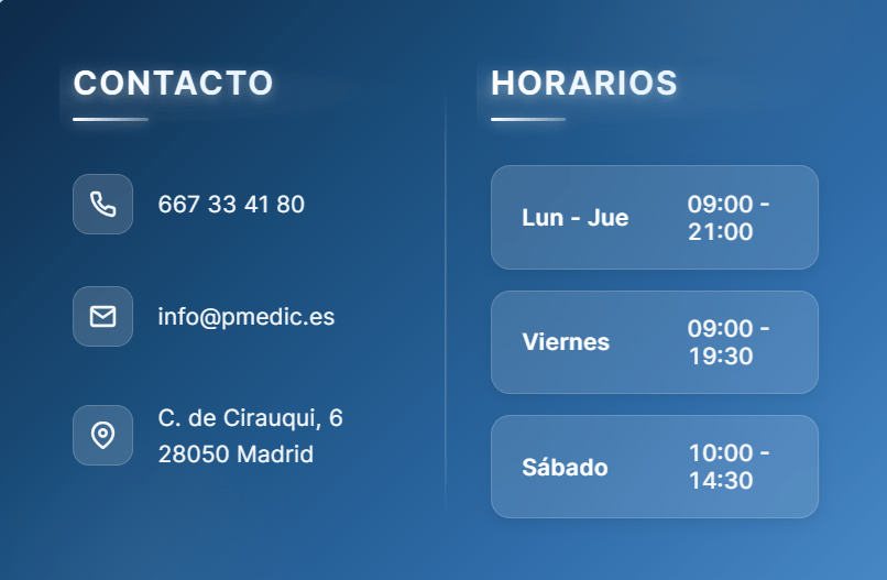En clínica Pmedic de Madrid tratamos patologías del sistema neuromusculoesquelético, tanto en fase aguda como crónica.